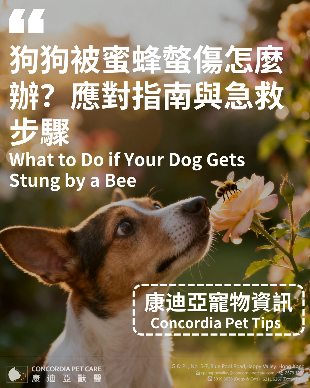 康迪亞獸醫隨時為您提供專業指導,確保您的狗狗獲得所需的照顧。如果您的狗狗被蜜蜂螫傷或您對寵物的健康有疑慮,請即刻聯繫我們。
